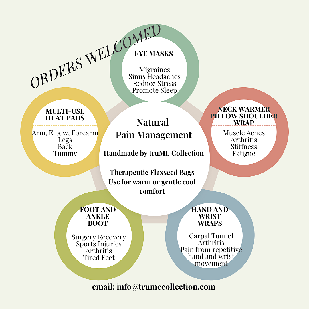 All truME Therapeutic Flaxseed Heat and Cold Bags and other gift items are made using quality fabric and materials. My therapeutic bags are only filled with all-natural organic flaxseed; no other fillers are used. When selecting a scented variation, the flaxseed is blended with organic lavender/chamomile or eucalyptus/peppermint with a trace of pure essential oils.
