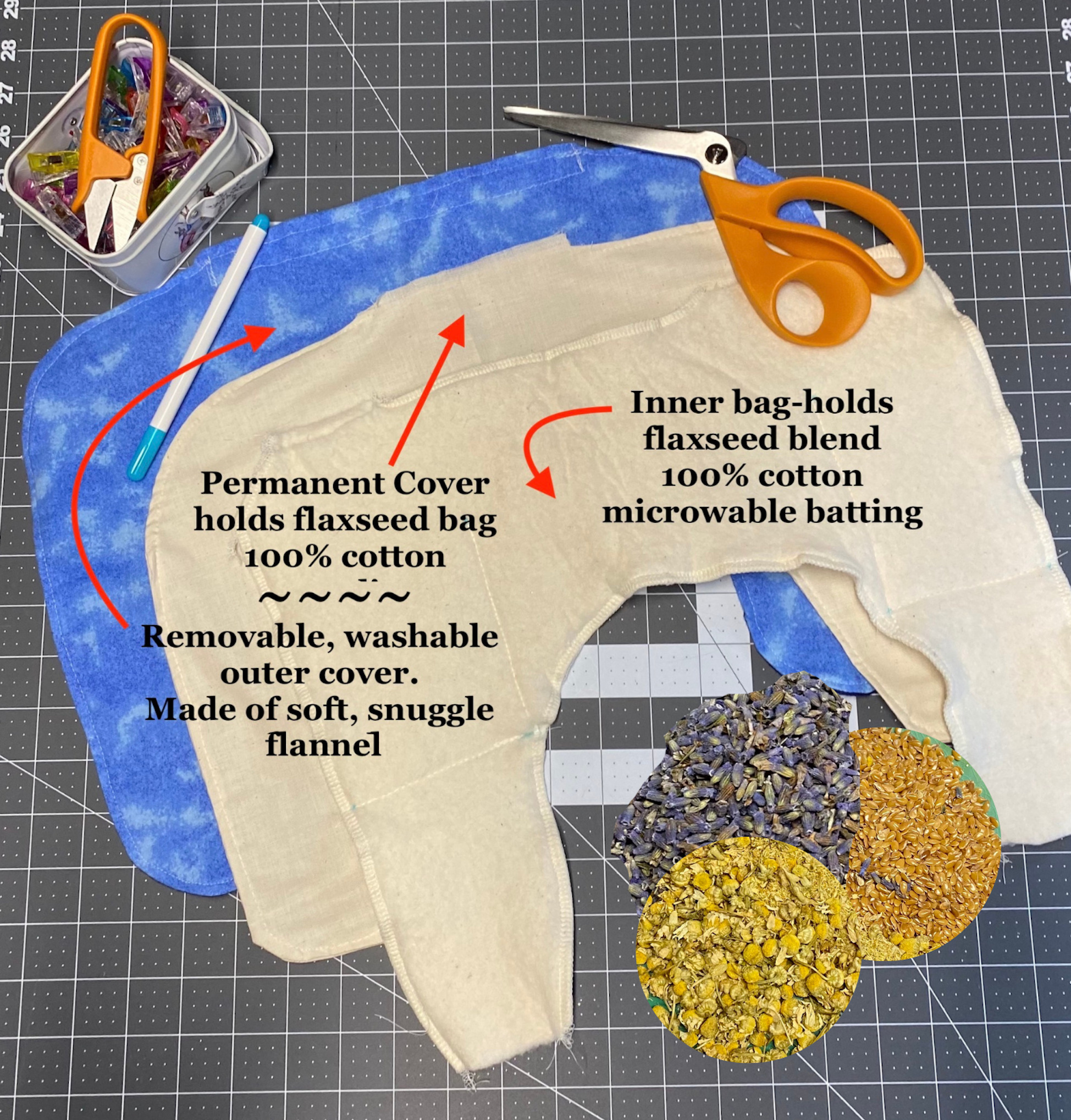 The neck wrap is available scented or unscented. The warm flaxseed provides a soothing sensation that relaxes and calms the body and mind. Heat it up, take it to bed for a warm hug.