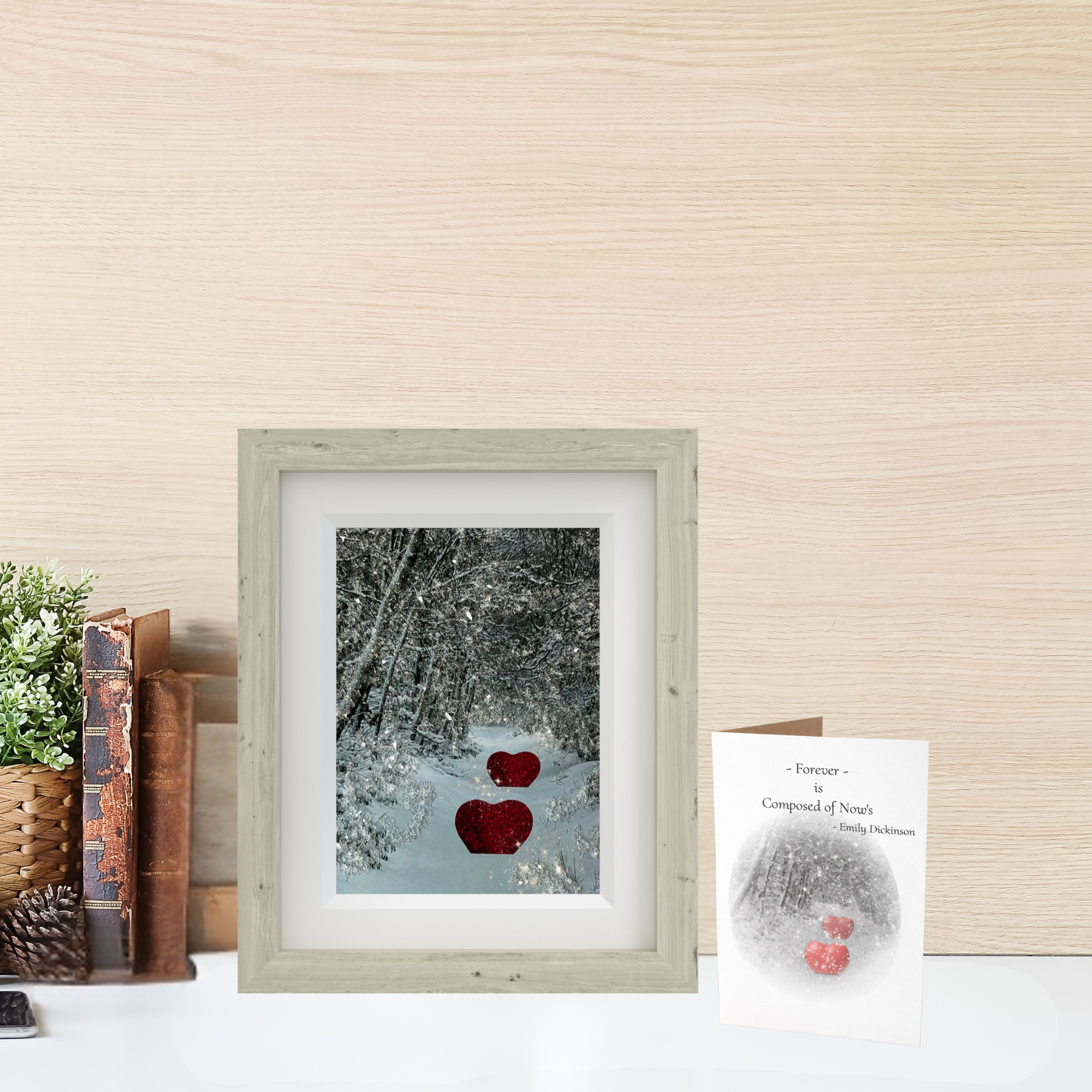 Celebrate love as a shared journey with Winter Path, a handmade photo glitter art piece featuring hearts that follow each other on a snowy path. The photograph was taken along a snow-covered woodland path in the mountains of upstate Pennsylvania, during an early morning hike, when the light was low, and the landscape felt still.